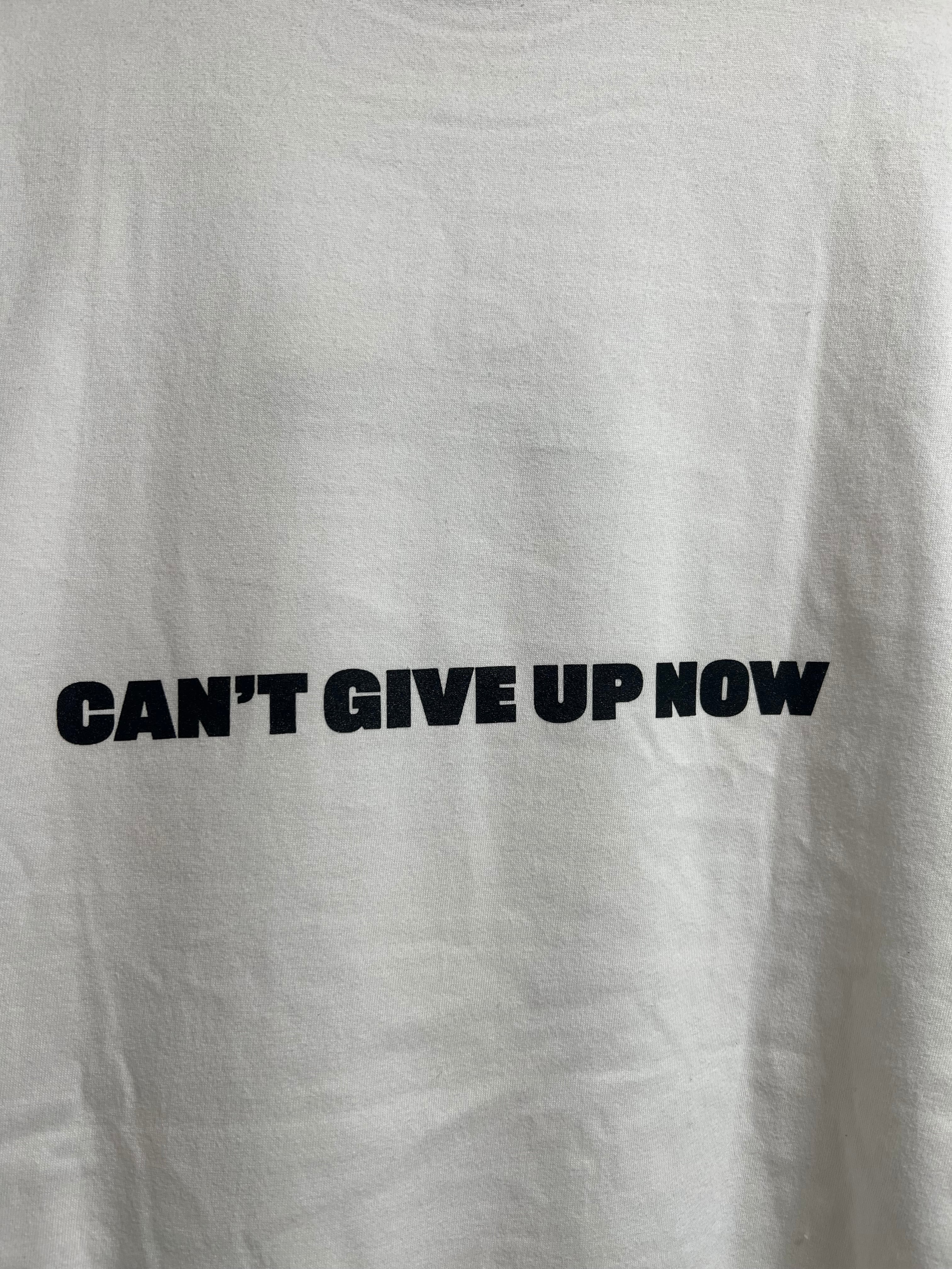 バックプリントには今は諦める事は出来ないという強いメッセージをほどこしたロングTシャツ。
